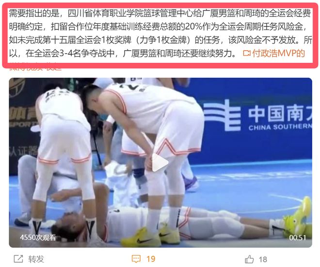 四川能让周琦替他们打球,那肯定是花了巨资掏了钱的,但他爆料称:“四川省体育职业学院篮管中心给广厦,给周琦开出的全运会经费时是这么说的,要扣留基础训练经费总额的20%,作为本次全运会的一个任务风险金,如果这次没有能够拿到奖牌的话,还得扣20%的钱。”