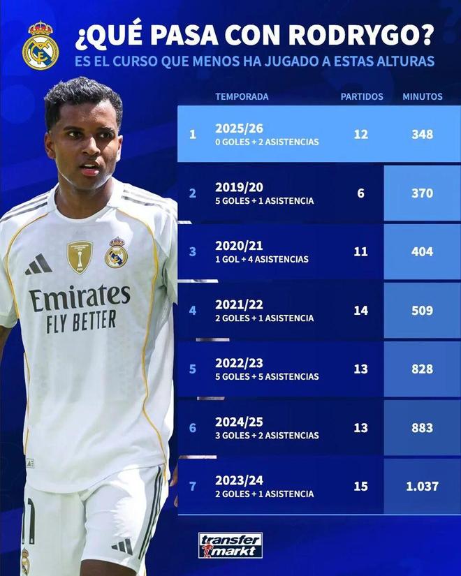 德转统计罗德里戈2019年夏天加盟以来,皇马各个赛季前15场球员的出场时间和进球助攻数据,本赛季罗德里戈登场12次,合计只有348分钟,0进球2助攻,均创下新低。