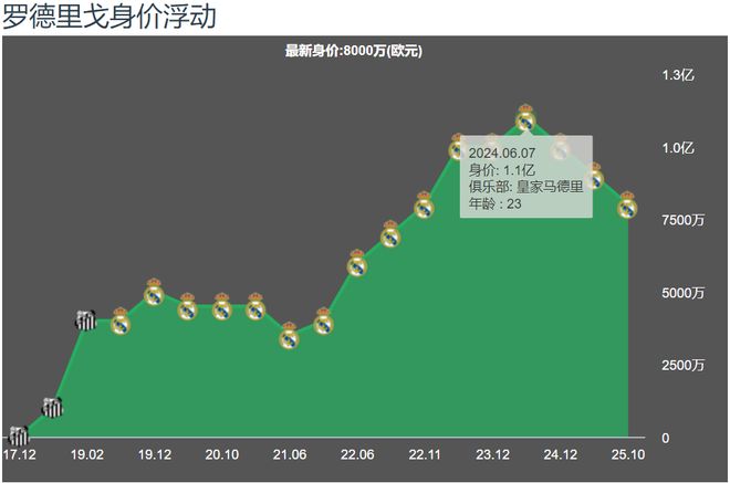 罗德里戈的市场价值已明显贬值,去年6月,罗德里戈的德转身价曾达到1.1亿欧高位,现在已经跌到8000万欧。