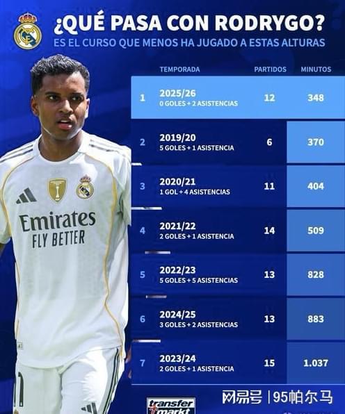 据统计,在本赛季亮相的16场比赛中,罗德里戈累计才捞到了3次首发机会,出场总时间只有452分钟,不足维尼修斯的1/3,个人贡献的2次助攻已是“最后的逞强”。